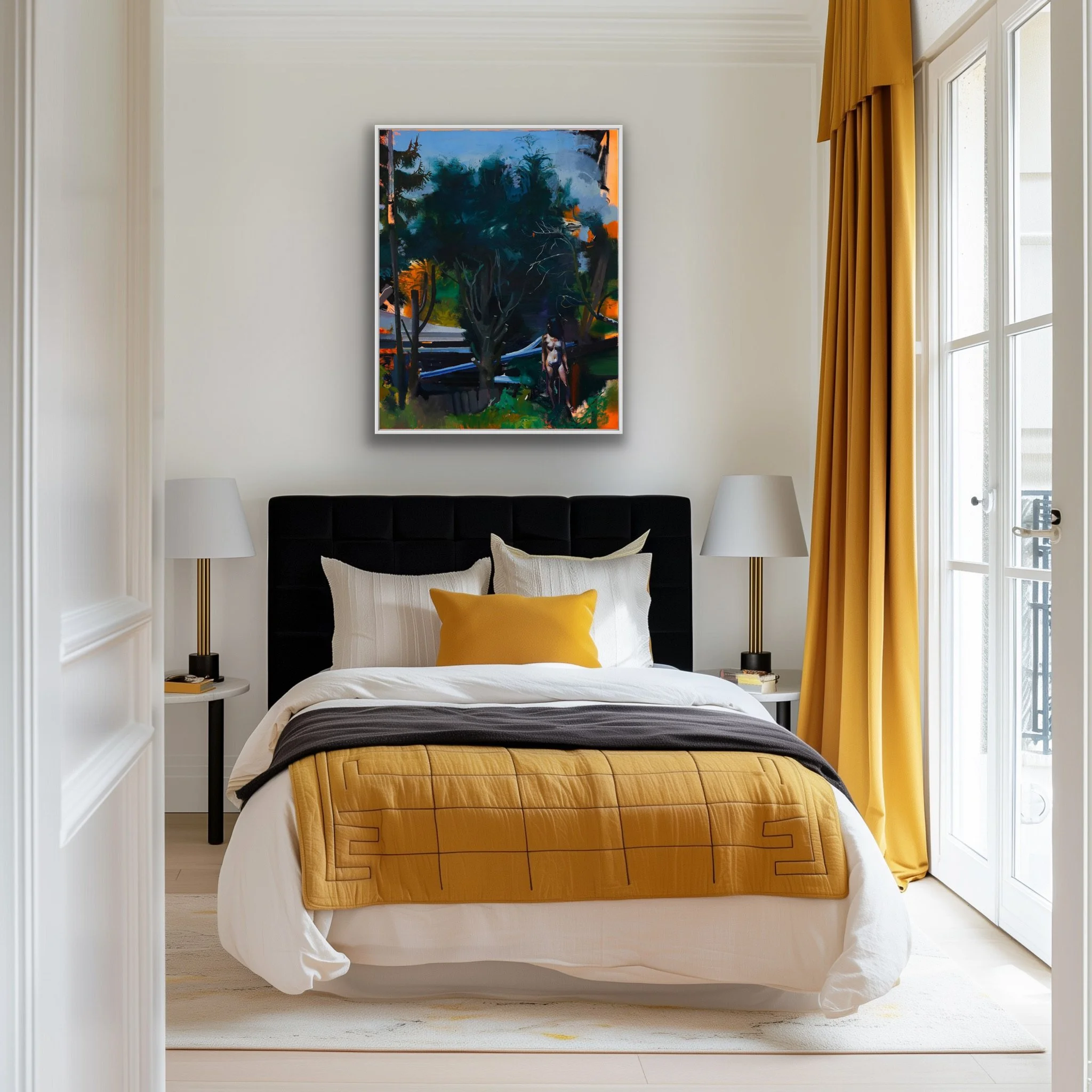 In dieser Arbeit von Rayk Goetze öffnet sich ein Bildraum, der sich nicht eindeutig als Landschaft oder Szene festlegen lässt. Die Figur tritt nur leise hervor, fast so, als gehöre sie bereits zu der Umgebung, in der sie steht. Dunkle Baumformen, gedämpftes Licht und verdichtete Farbe schaffen eine Atmosphäre, die eher andeutet als erklärt.