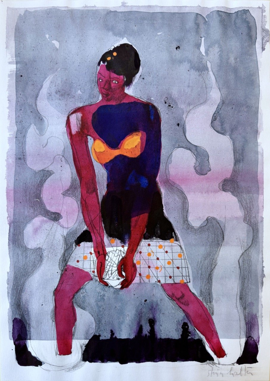 Diese Zeichnung von Rayk Goetze zeigt eine einzelne Figur in einer konzentrierten, fast angespannten Haltung. Farbe und Linie greifen ineinander, ohne sich gegenseitig zu dominieren. Die Figur wirkt zugleich präsent und fragil, körperlich deutlich, aber emotional offen. Gerade diese Mischung verleiht dem Blatt seine besondere Intensität.