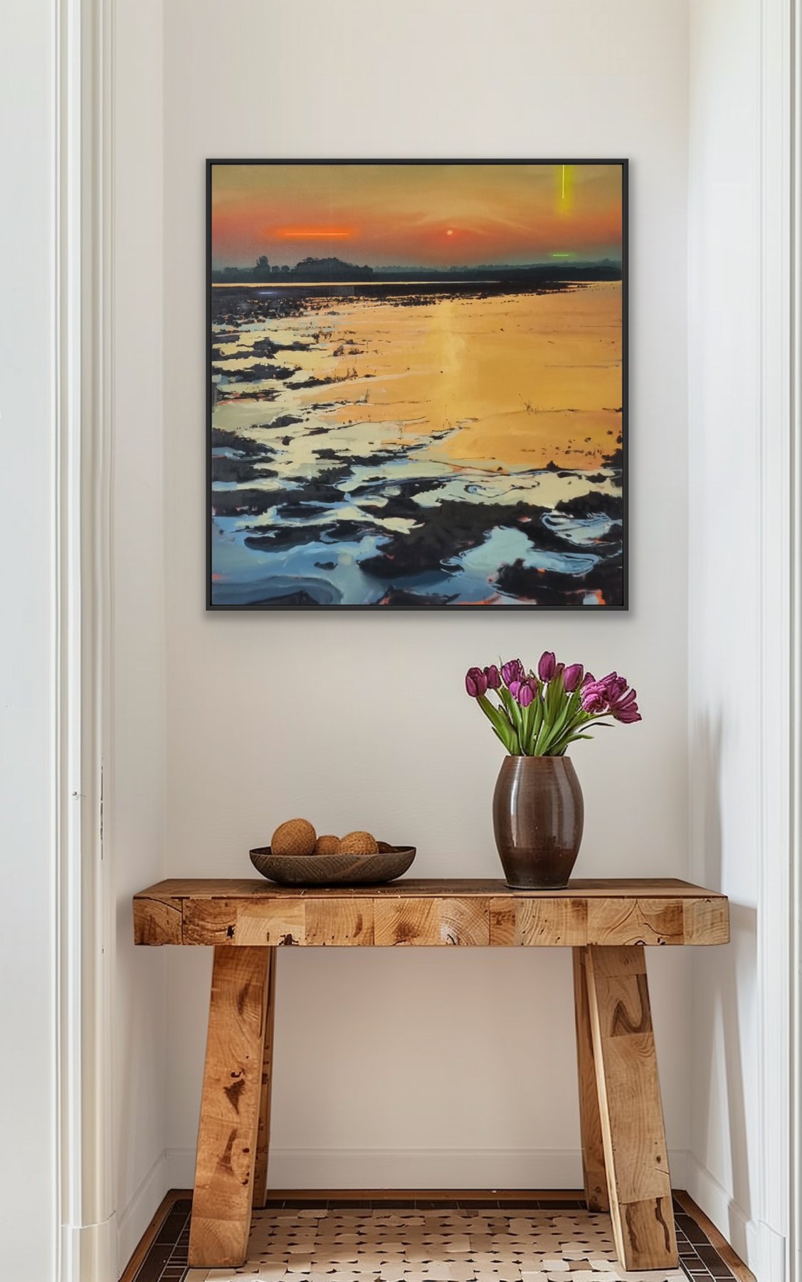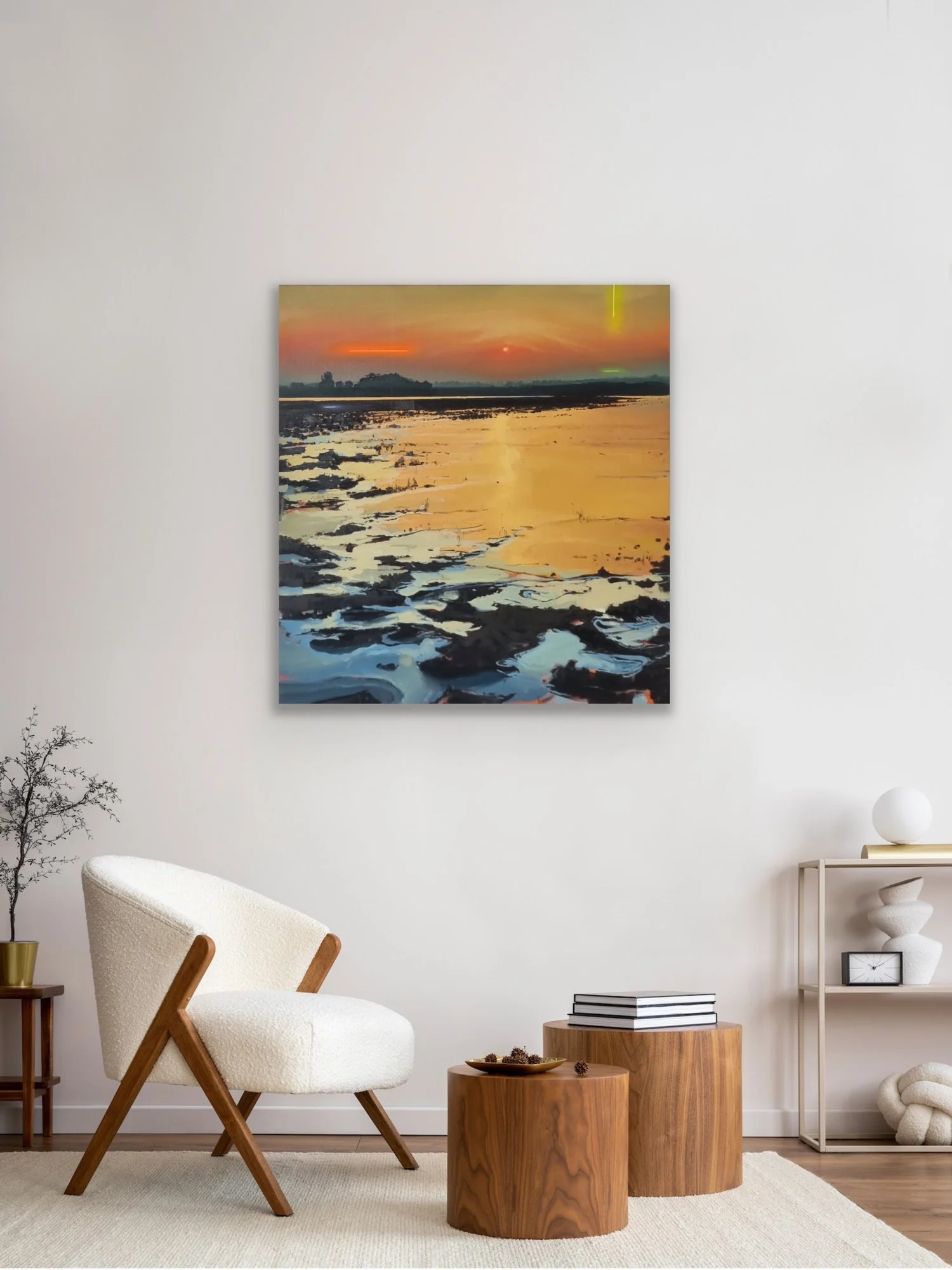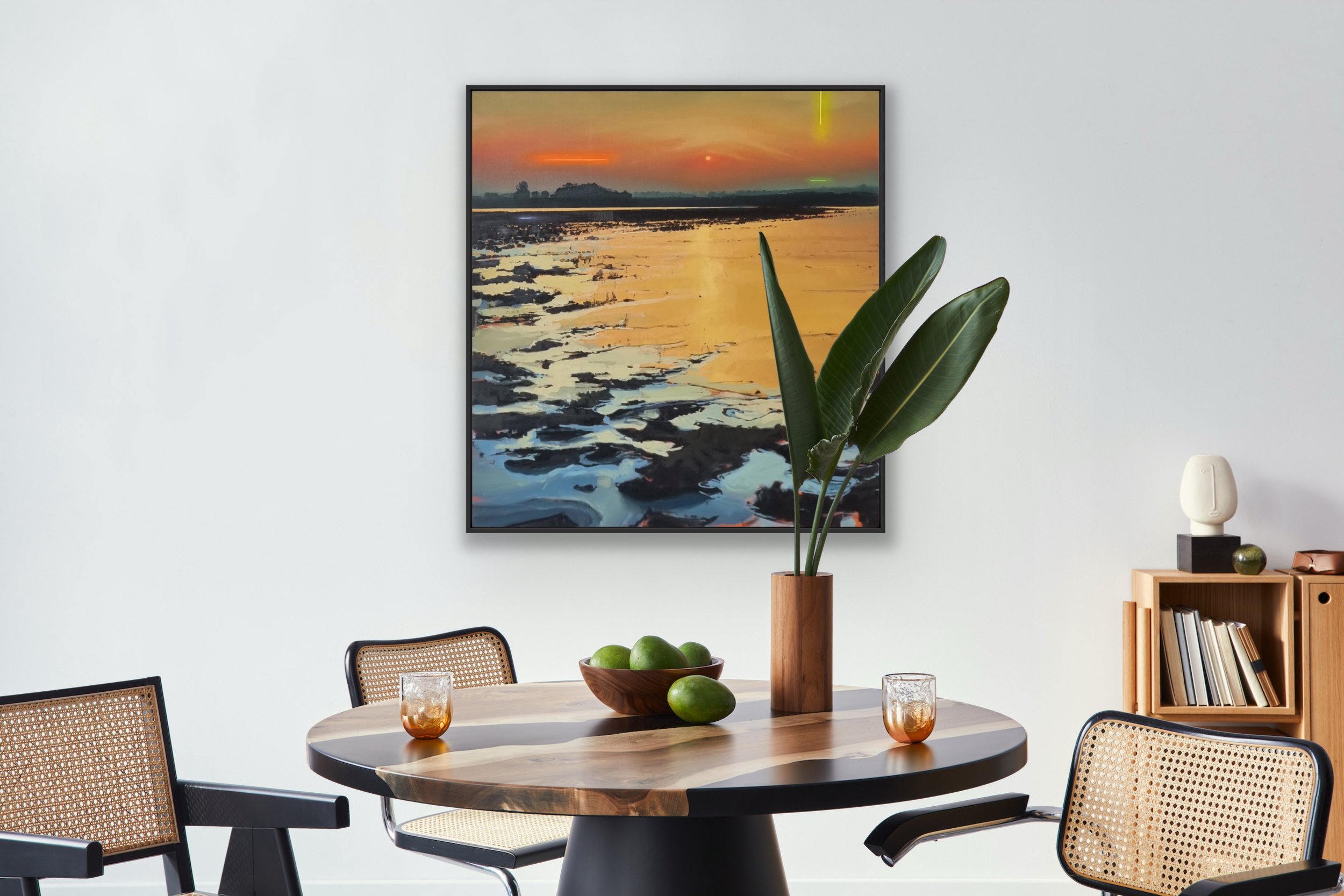 In “the new suns” öffnet sich eine Landschaft, die zugleich vertraut und fremd wirkt. Eine weite Fläche aus Wasser, Sand und Spiegelungen liegt unter einem Himmel, der sich langsam in Licht auflöst. Am Horizont erscheint eine Sonne – klein und zurückhaltend –, deren Auftauchen die Ordnung des Bildraums verändert. Licht bricht sich im Wasser, Farben verschieben sich, Formen lösen sich im Übergang zwischen Fläche und Reflexion.