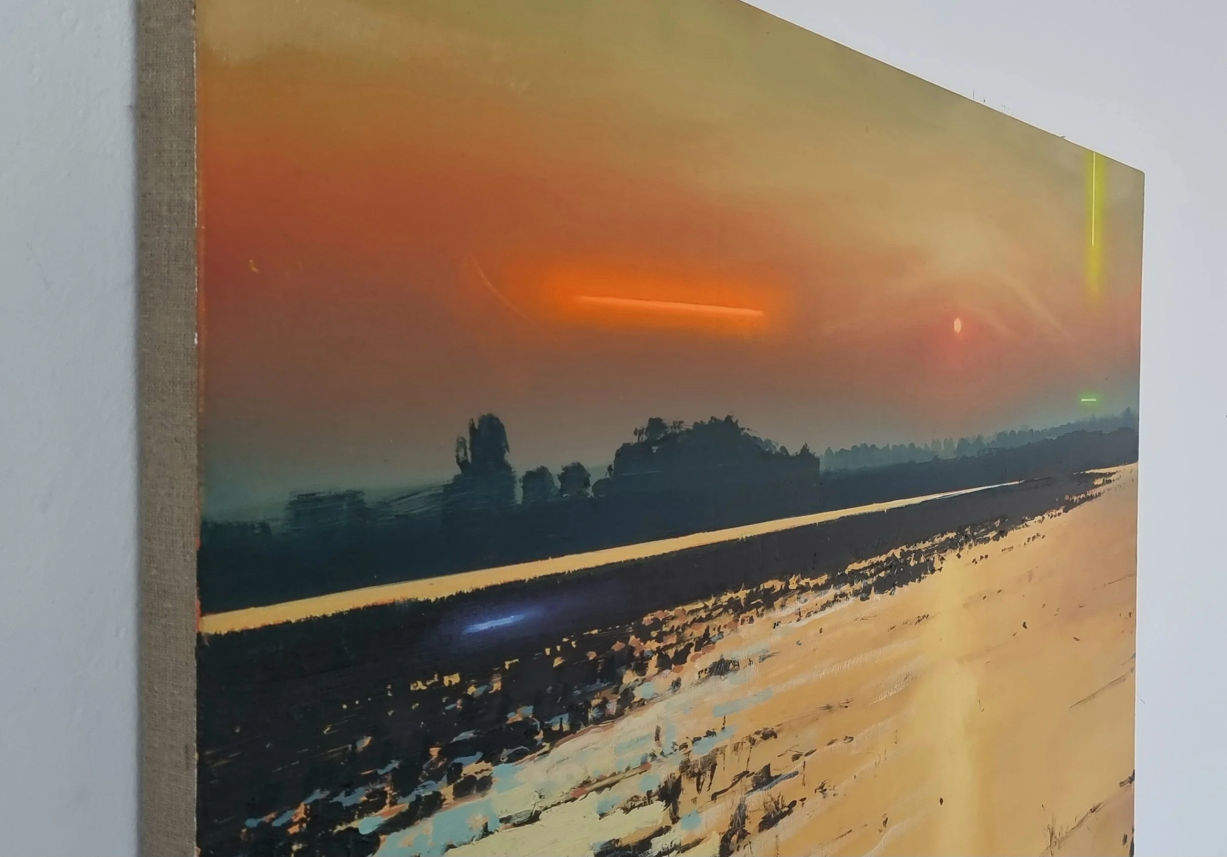 Sebastian Menzke arbeitet mit einer Spannung, die sein gesamtes Werk prägt: dem Dialog zwischen klassischer Malerei und einer subtilen Verschiebung des Gewohnten. Landschaft – eines der ältesten Motive der Kunstgeschichte – wird in seiner Malerei nicht nostalgisch wiederholt, sondern neu gedacht. Die Atmosphäre wirkt zunächst ruhig und beinahe traditionell, doch gezielte Eingriffe verändern die Realität des Bildes: Lichtstreifen, die wie fremde Spuren erscheinen, oder Farbsetzungen, die sich der natürlichen Ordnung entziehen.