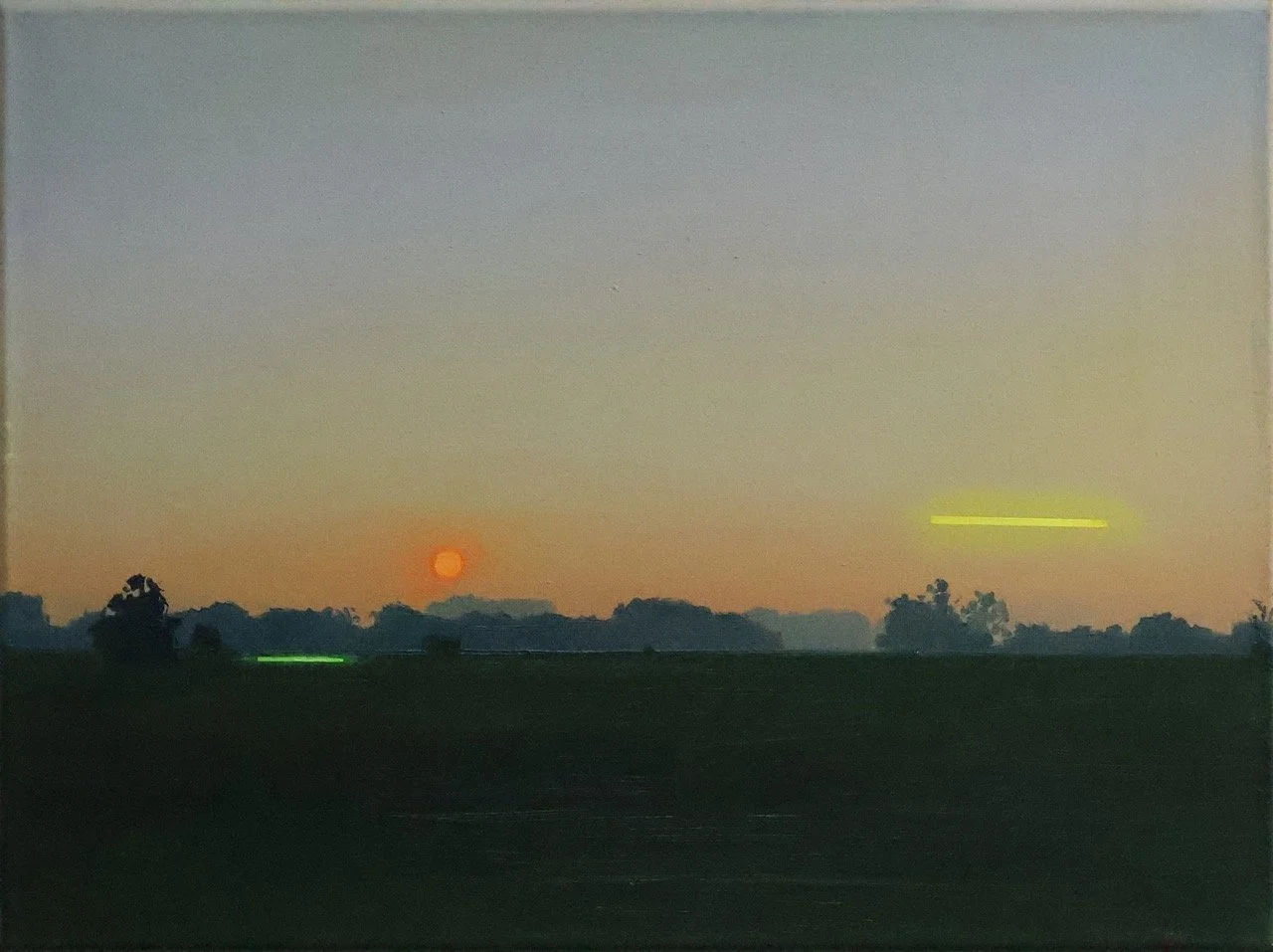 In der Werkserie „the sun the sun“ widmet sich Sebastian Menzke einem der ältesten Motive der Malerei: der Landschaft im Licht der untergehenden Sonne. Weite Horizonte, dunkle Silhouetten und glühende Himmel erinnern zunächst an die Tradition klassischer Landschaftsmalerei – an jene Momente, in denen Licht und Raum zu einer stillen, beinahe zeitlosen Atmosphäre verschmelzen.