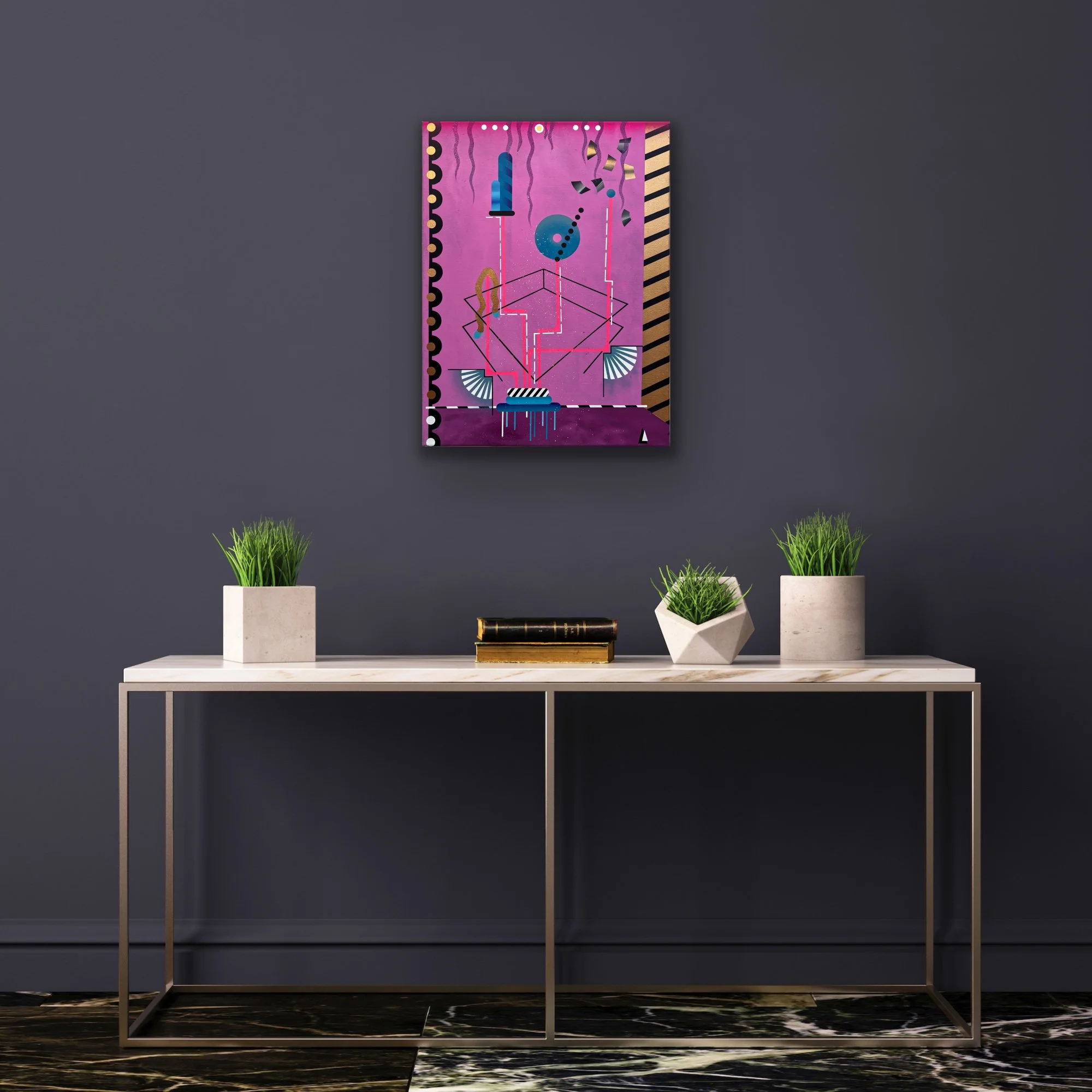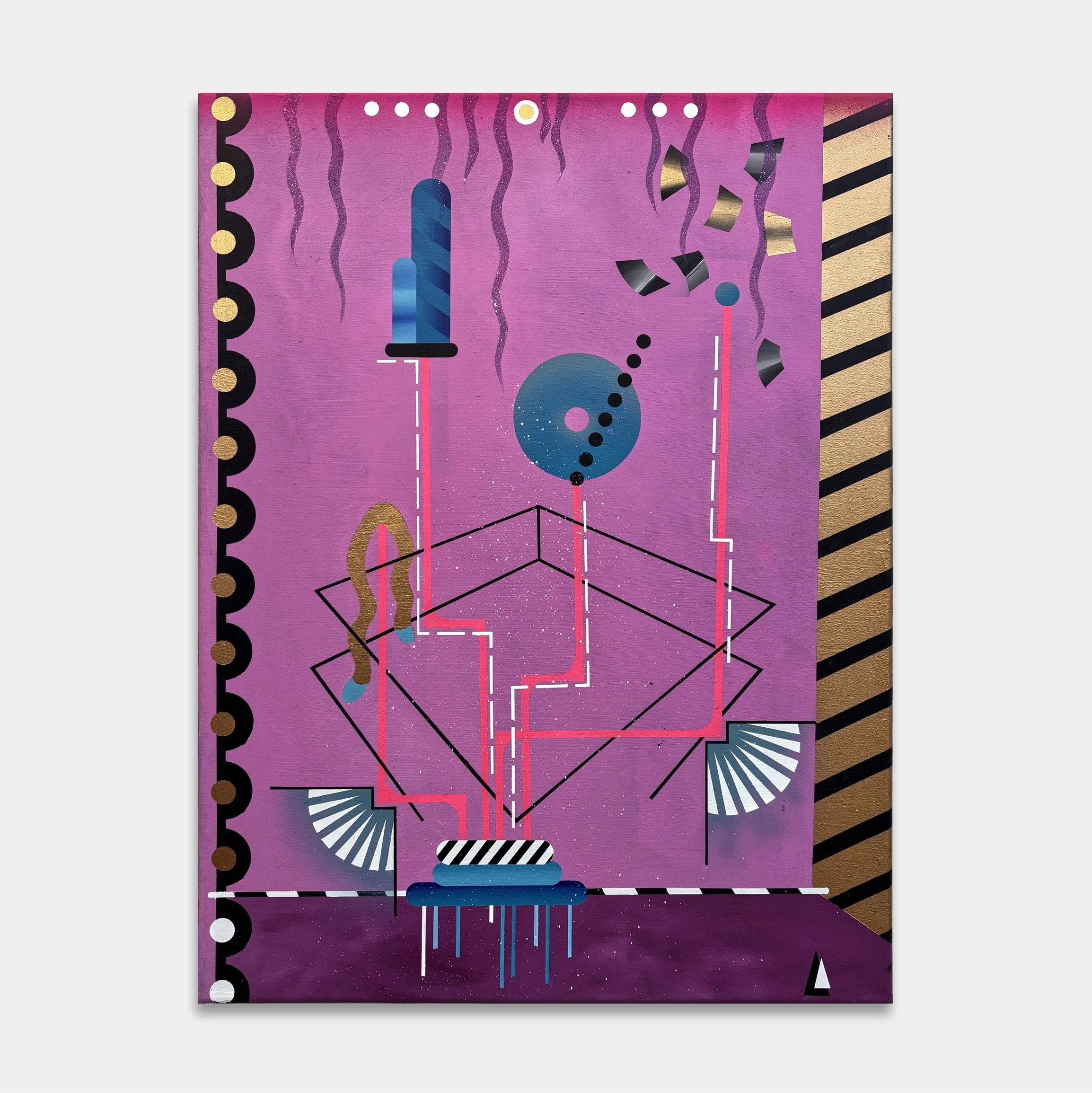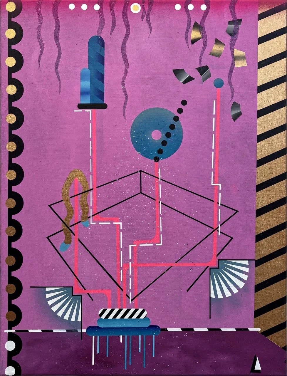 Happy New Year wirkt wie ein Plan, der sich selbst erfindet. Unten ein Sockel, fast wie eine Bühne oder ein Startpunkt, aus dem Linien aufsteigen und sich durch das Bild bewegen. Sie erinnern an Leitungen, an Wege, an Abläufe – und verlieren doch jede klare Funktion. Dazwischen: Kreise, Fragmente, ornamentale Formen, goldene Akzente, die etwas Feierliches haben. Das flirrende Pink hält alles zusammen, wie ein Raum, in dem diese Elemente gleichzeitig schweben und verbunden sind.