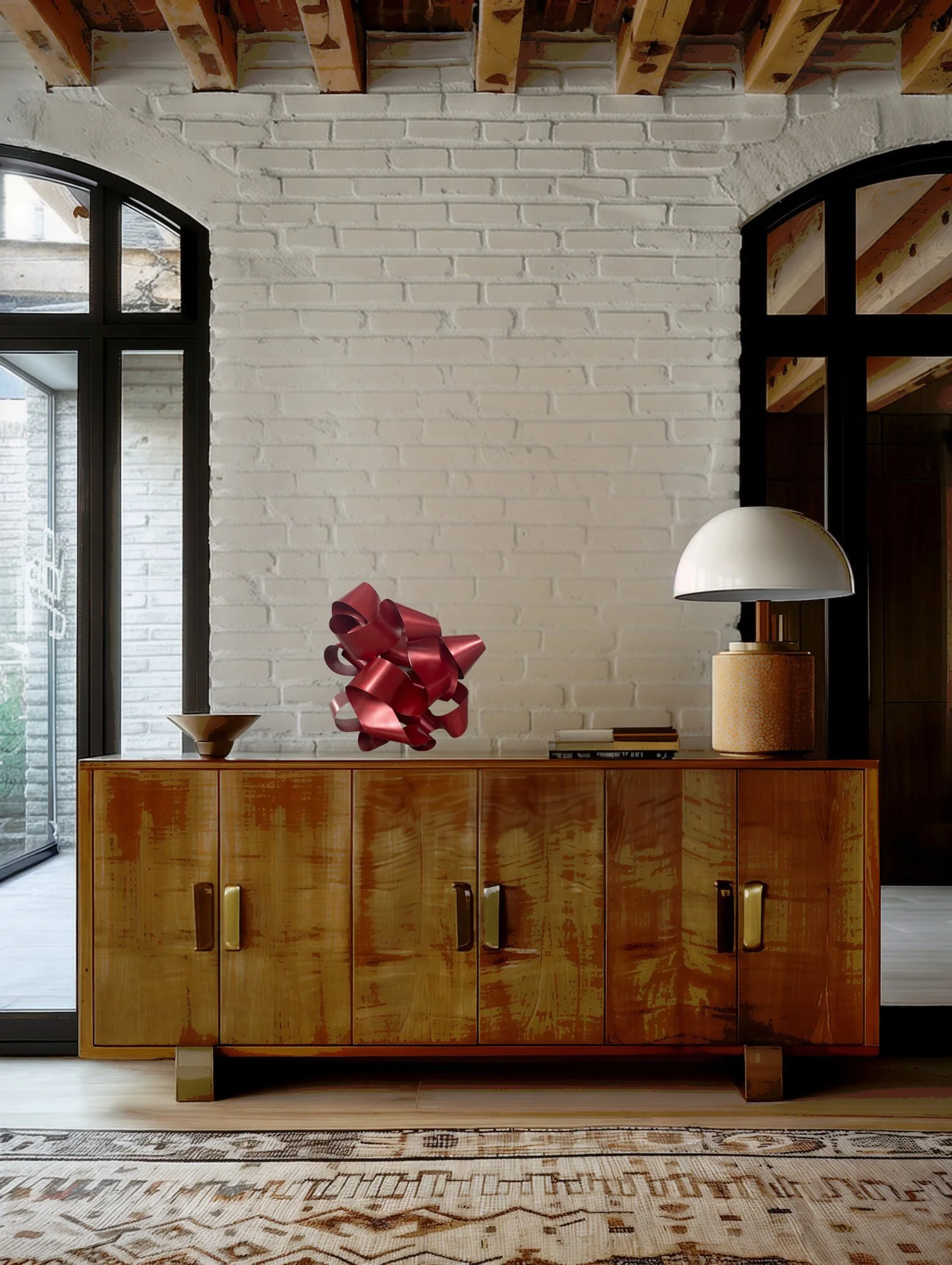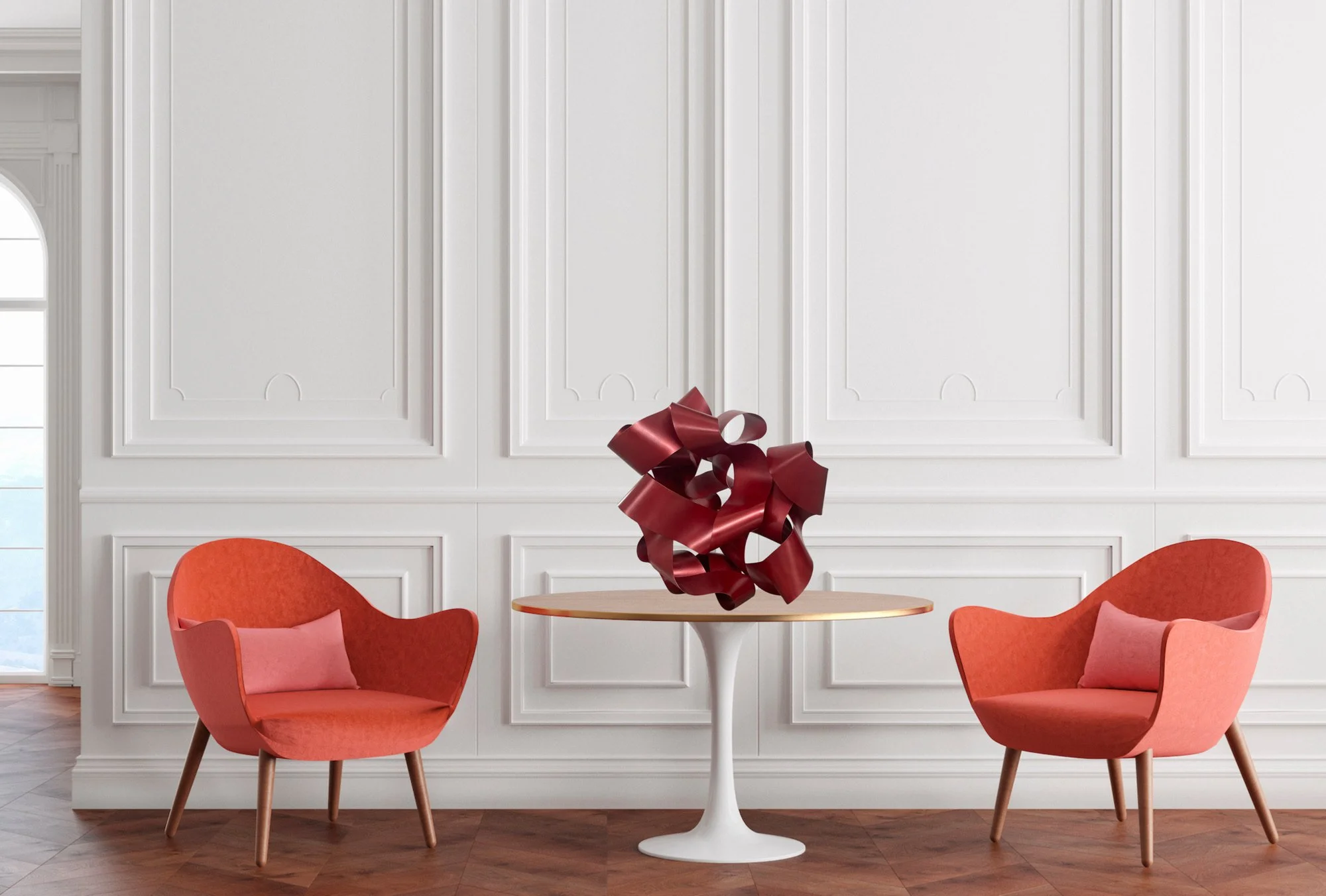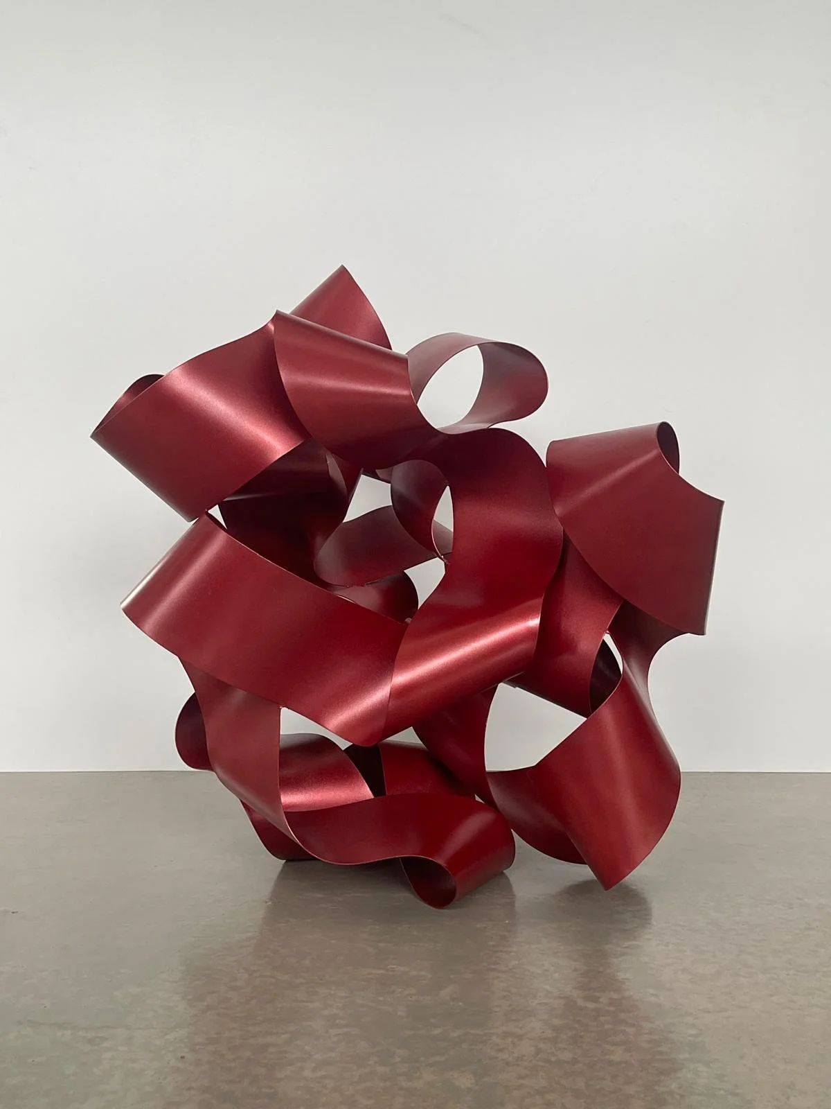 In “loop,” Hans Schüle transforms rigid steel into a surprising lightness. The deep red lacquer amplifies the dynamism of sweeping bands that twist, intertwine, and open again. The sculpture feels like a frozen moment of an endless dance – powerful yet full of grace.