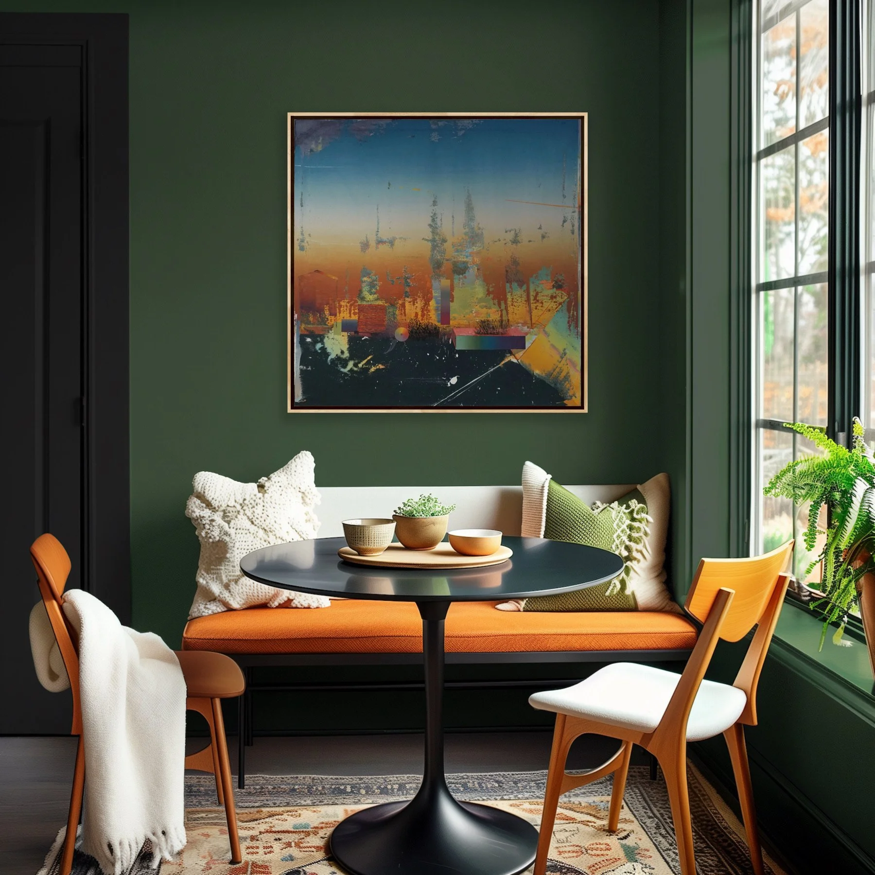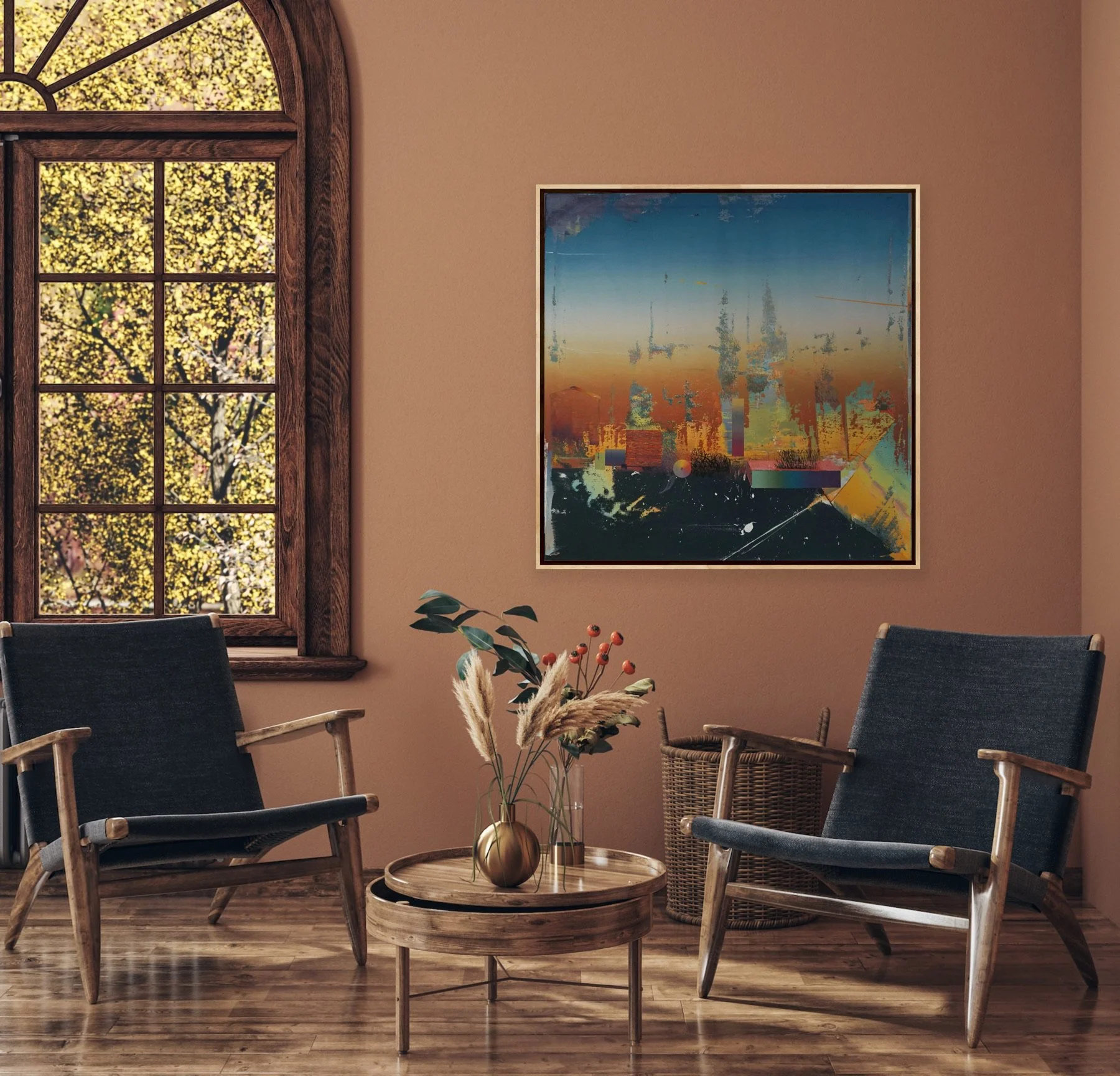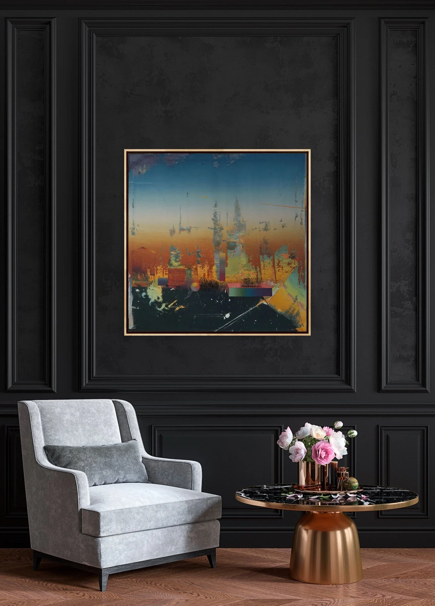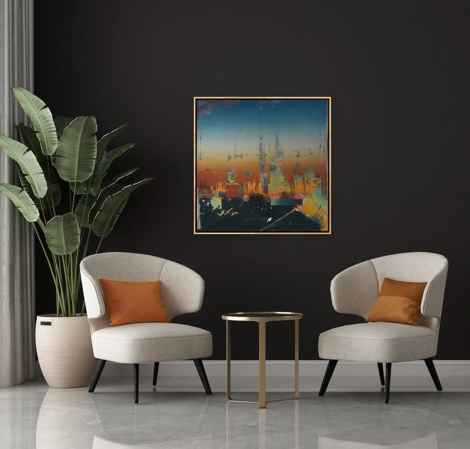 In Atmo spannt Menzke einen Bildraum auf, der zwischen Landschaft und Abstraktion oszilliert. Farbfelder von tiefem Blau, glühendem Orange und erdigen Grüntönen begegnen sich in Schwebezuständen. Keine Kulisse, sondern ein vibrierendes Feld: das Blau öffnet Ferne, das Orange brennt als Glut im Innern, die dunklen Partien erden und halten zurück. Diese Kräfte balancieren einander und halten den Blick in Bewegung – wie ein atmender Rhythmus von Aufbruch und Ruhe.