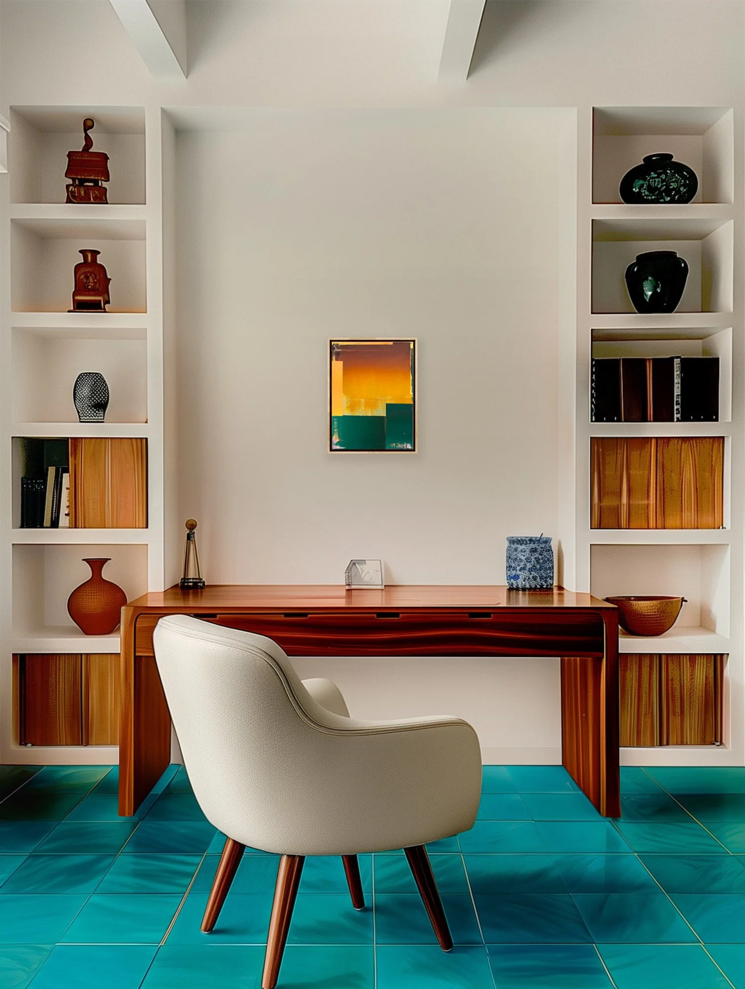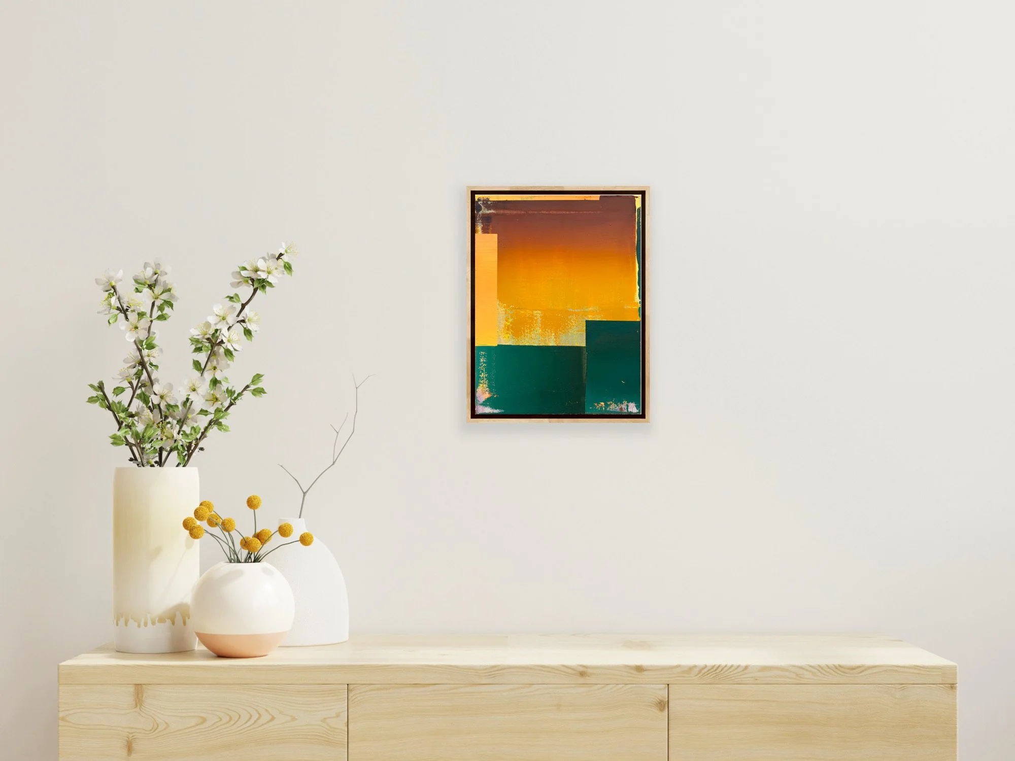 room 5, 2023 (Öl auf Leinwand, 30 × 40 cm, Unikat, signiert) zeigt Menzkes souveränen Umgang mit Farbe als architektonischem Material. Die leuchtenden Übergänge von sattem Orange zu erdigem Braun kontrastieren mit den tiefen Grünflächen im unteren Bildbereich. Daraus entsteht eine klare, fast tektonische Struktur, die dennoch offen bleibt für Assoziationen – Landschaft, Architektur, Licht.