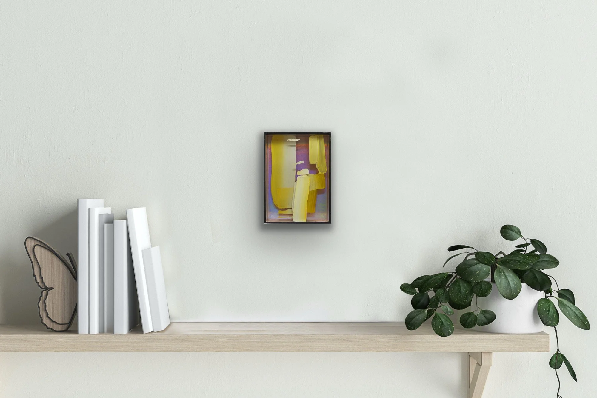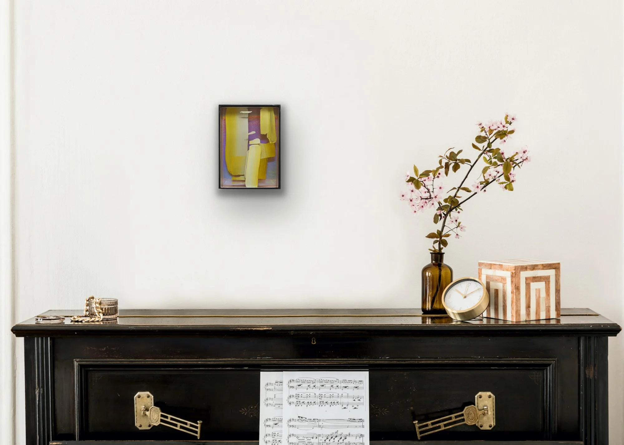 Despite its small format, the work creates a monumental impression. The luminous bands of color resemble frozen movements – a choreography of painting and material held in place. The smooth resin surface intensifies the sense of spatiality and transformation.