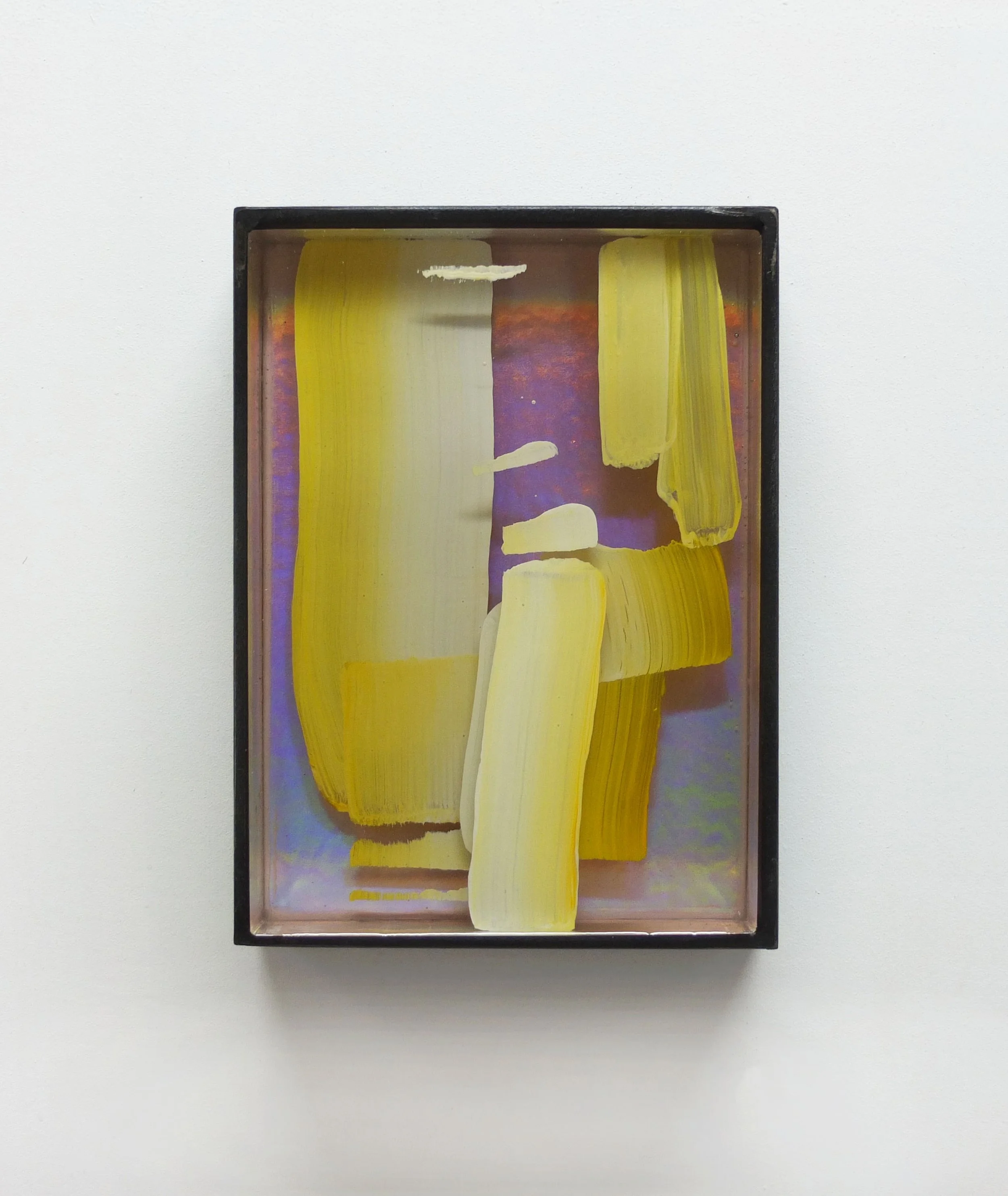 In „flipflop3“ entfaltet Sebastian Menzke die poetische Kraft des Epoxidharzes in Verbindung mit kraftvollen Pinselgesten. Breite gelbe Farbflächen schweben über einem irisierenden Grund, der im Wechselspiel des Lichts changiert. Mal leuchten sie warm und nah, mal treten sie zurück und öffnen den Blick in eine schimmernde Tiefe.