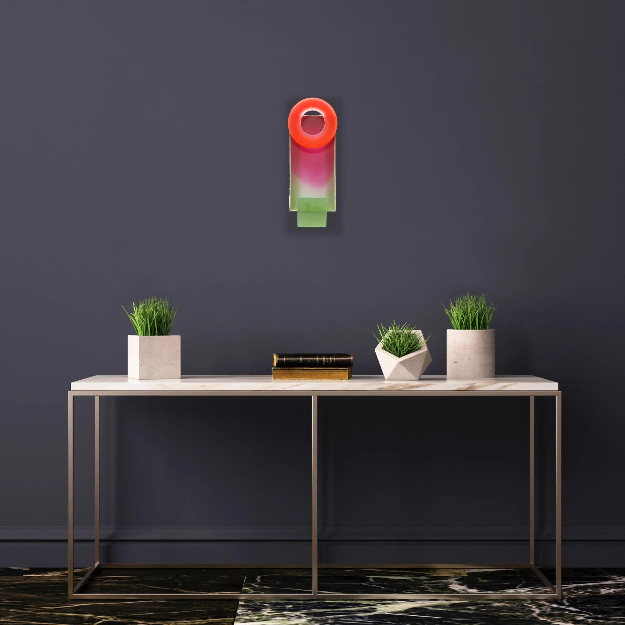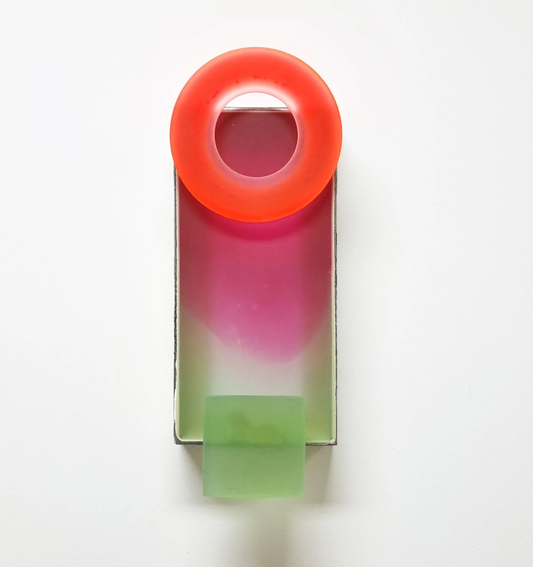 In „heard“ verbindet Sebastian Menzke die Präzision klarer Geometrie mit der Sinnlichkeit leuchtender Farbtiefe. Das gefärbte Epoxidharz wirkt wie Glas oder Kristall – kühl und streng, zugleich aber voller Schichtungen, die ein verborgenes Eigenleben andeuten. Diese Doppelbödigkeit macht den Reiz des Werkes aus: es ist Objekt und Illusion, Designarchitektur und freie Kunst zugleich.