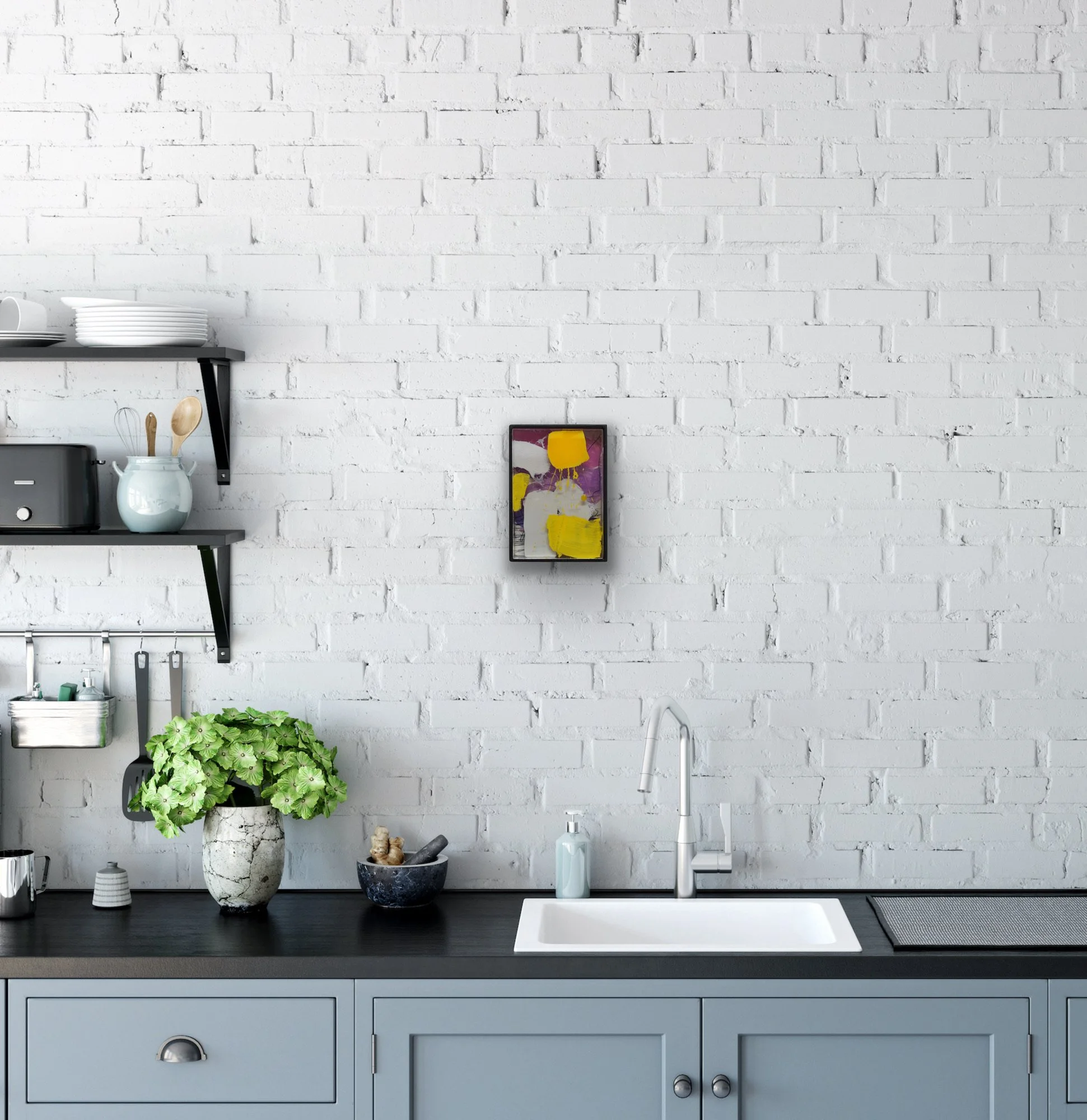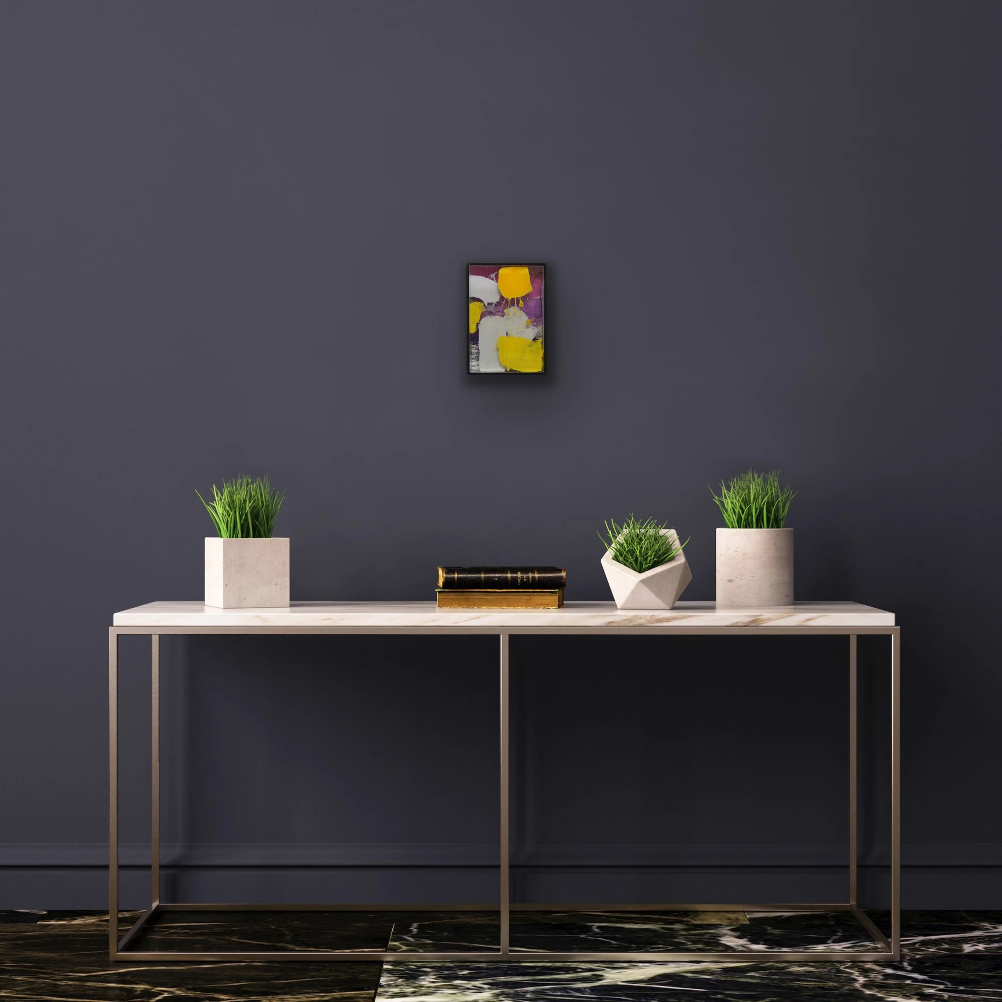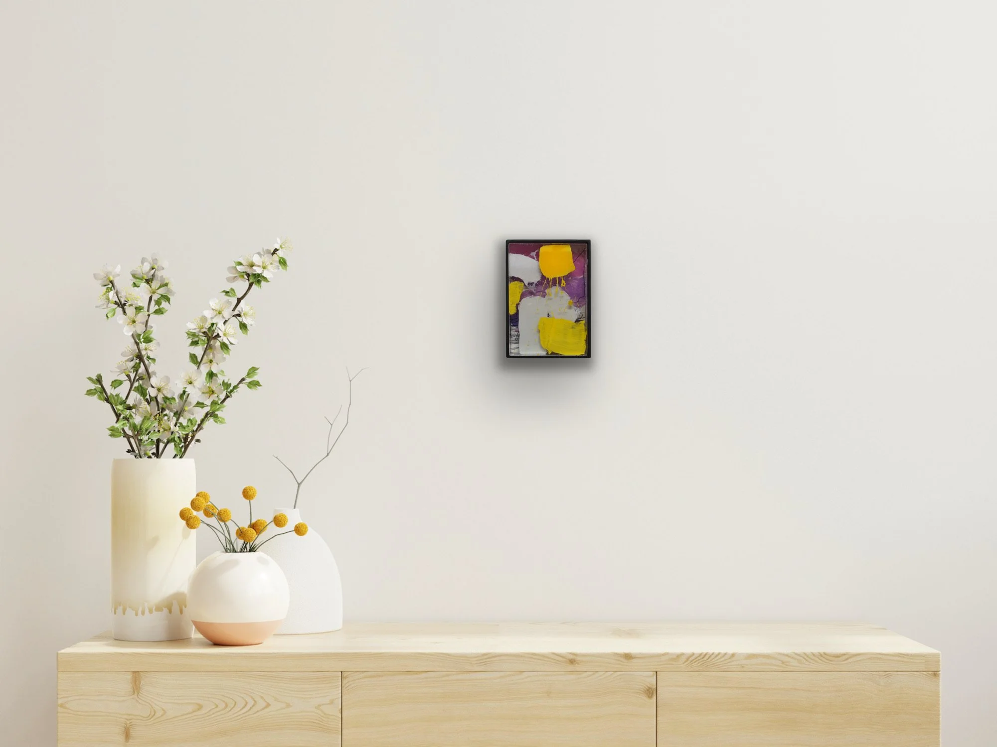 In „retro2“ zeigt Sebastian Menzke die ganze Kraft des malerischen Ausdrucks im Medium Epoxidharz. Leuchtendes Gelb und reines Weiß treffen auf einen violett changierenden Grund, der in der Tiefe irisierend wirkt. Die kräftigen Farbgesten scheinen direkt aus der Malerei entnommen und im transparenten Harz eingefangen zu sein.